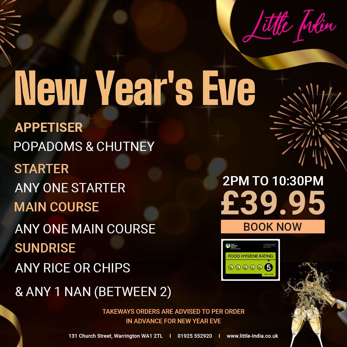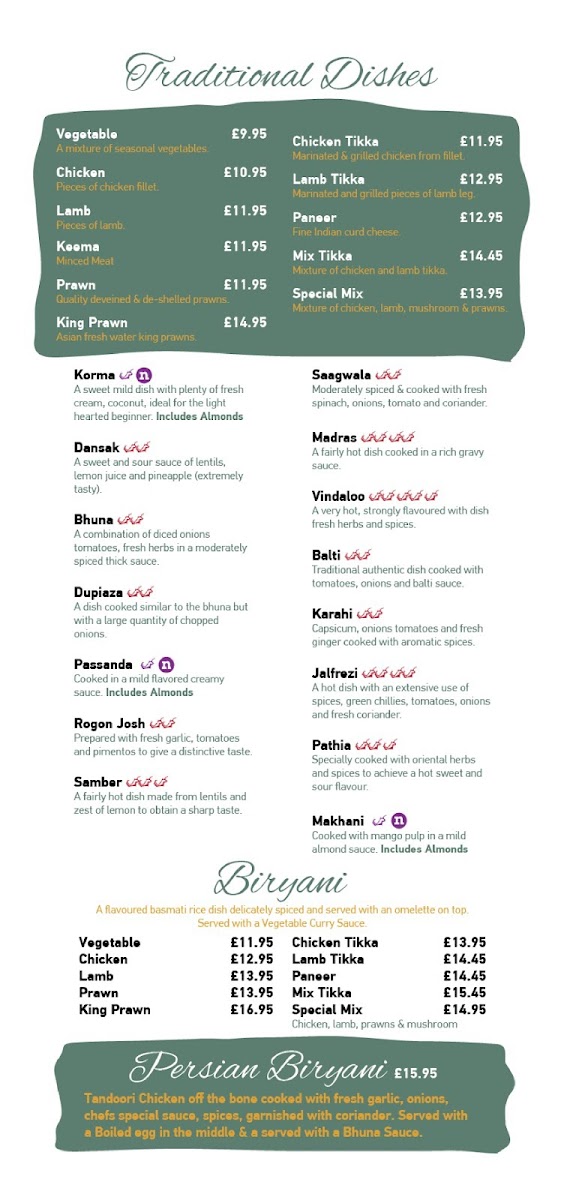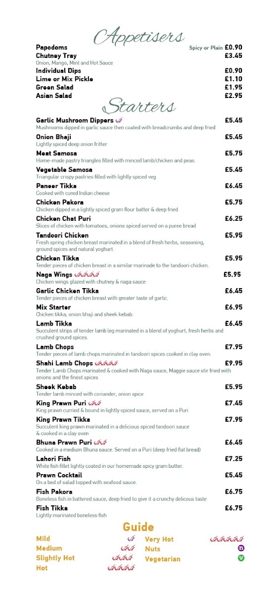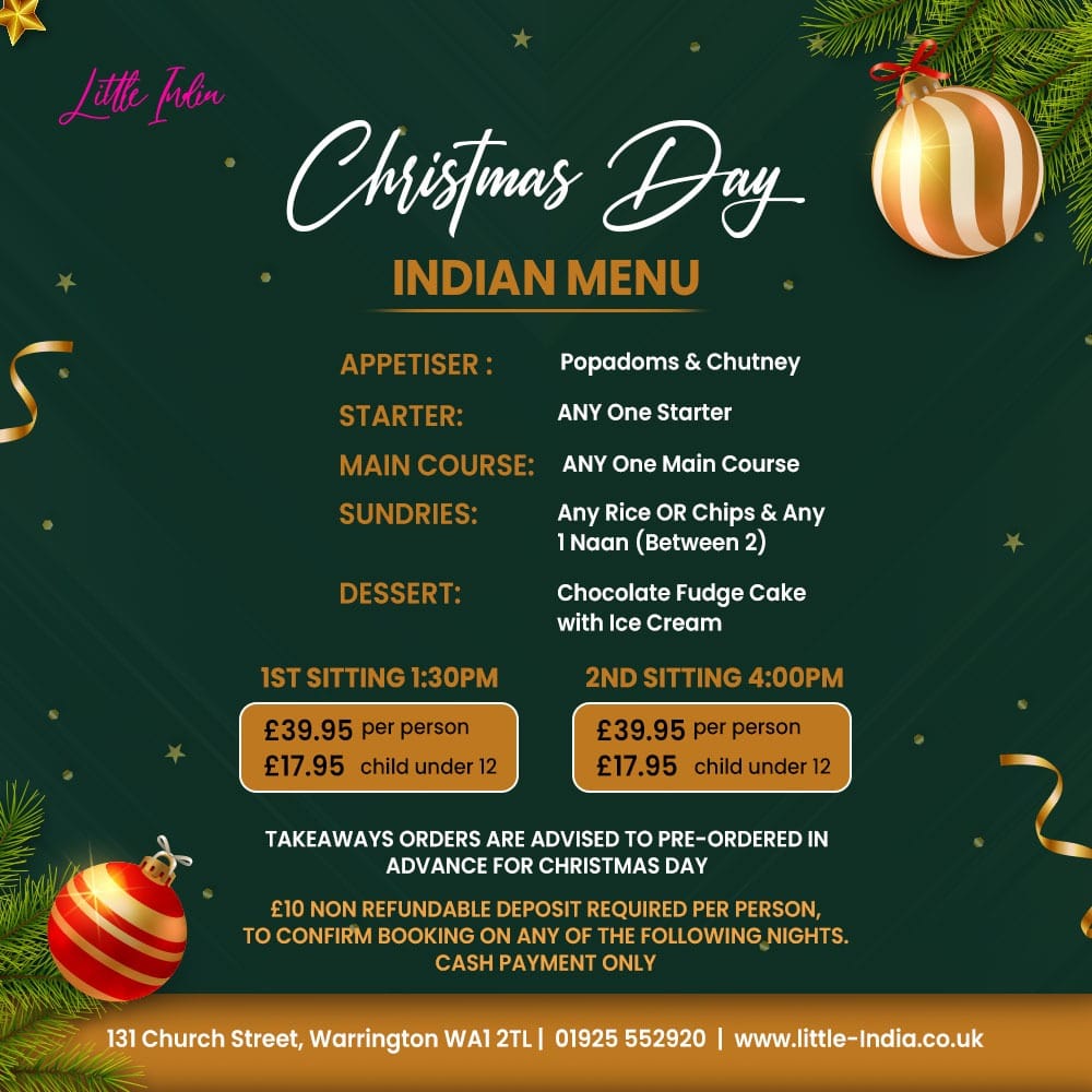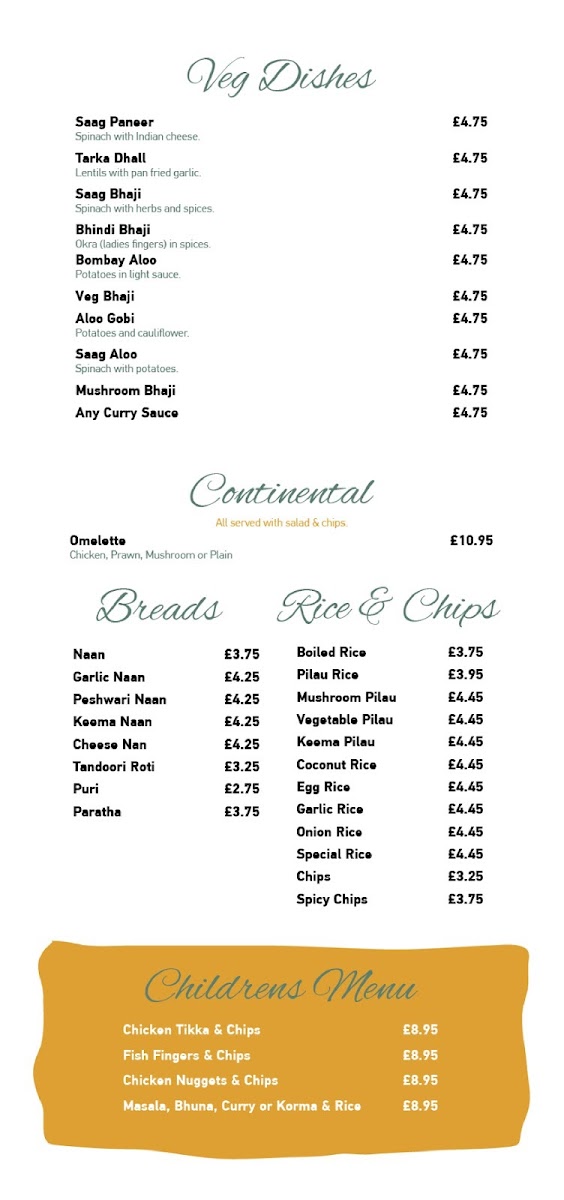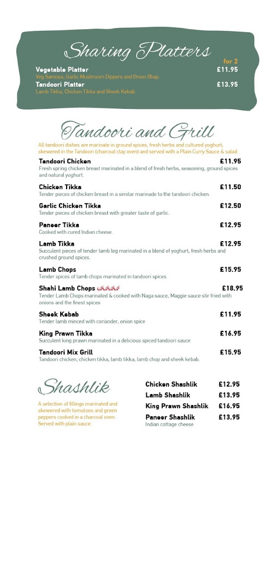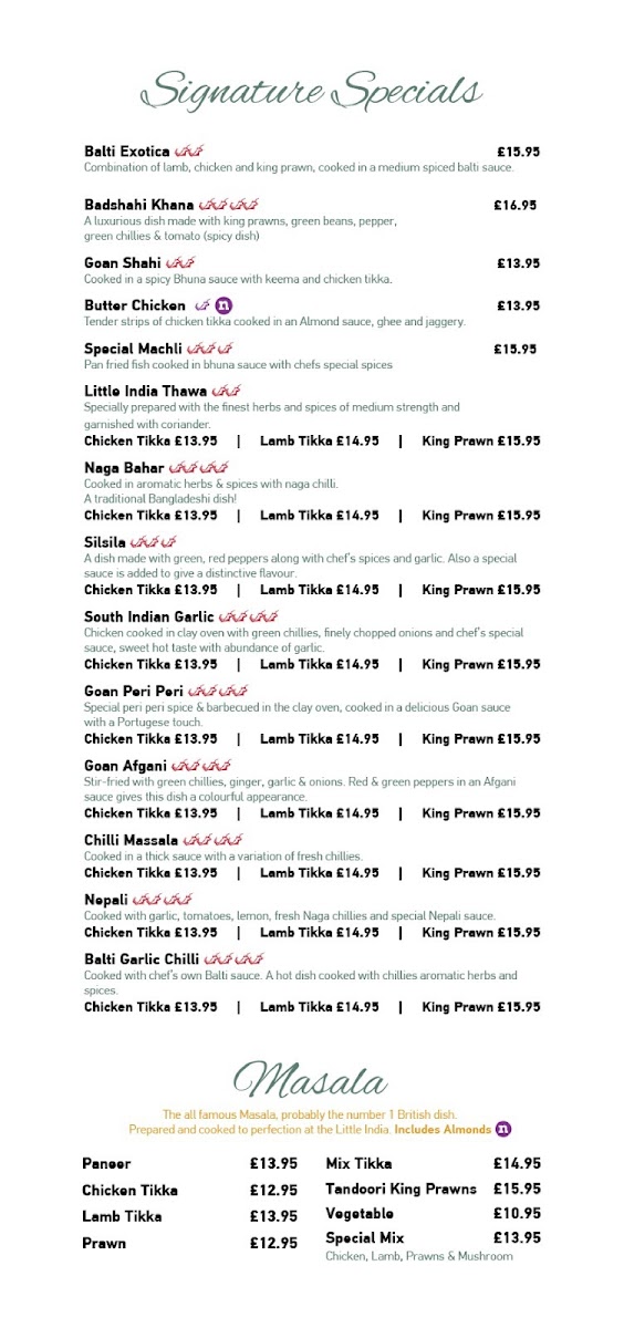 From a reviewer's perspective, the menu at Little India At The Ring O' Bells at 131 Church St, Warrington WA1 2TL, United Kingdom, offers a rich and varied selection that caters to all tastes. The appetisers such as Spicy Papodom, Plain Papodom, and the Chutney Tray with Individual Dips and Lime Pickle provide a flavorful start. For starters, choices like Garlic Mushroom Dippers, Onion Bhaji, Meat Samosa, Vegetable Samosa, and Paneer Tikka Starter are perfectly suited for sharing, especially alongside the Vegetable Platter For 2 or the Tandoori Platter For 2. The Tandoori and Grill section features highlights like Tandoori Chicken Main, Chicken Tikka Main, Garlic Chicken Tikka Main, Paneer Tikka Main, and Lamb Tikka Main, offering both smoky and succulent options. Traditional curries, including Vegetable Korma, Chicken Korma, Lamb Korma, Keema Korma, and Prawn Korma, sit alongside signature specials like Exotica Balti, Badshahi Khana, Goan Shahi, Butter Chicken, and Special Machli, providing a distinctive twist for those seeking something more adventurous. The Masala Dishes-from Paneer Masala to Mix Tikka Masala-and Shashlik Dishes, including Chicken Shashlik and King Prawn Shashlik, offer vibrant flavors and generous portions. Biryani dishes, such as Vegetable Biryani and King Prawn Biryani, complement the extensive vegetarian options like Saag Paneer, Tarka Dhall, and Bhindi Bhaji. For lighter or more familiar meals, the Continental Dishes like Chicken Omelette and Prawn Omelette, along with the simple yet essential Rice and Chips and an array of breads including Naan, Garlic Naan, and Peshwari Naan, round out the menu. Even the Children’s Menu, featuring options such as Kids Chicken Tikka & Chips and Kids Masala And Rice, ensures that younger diners are well catered for. Overall, the menu at Little India combines traditional Indian favorites with innovative specials, generous portions, and a spectrum of vegetarian and meat-based dishes, making it a versatile and satisfying choice for any occasion.